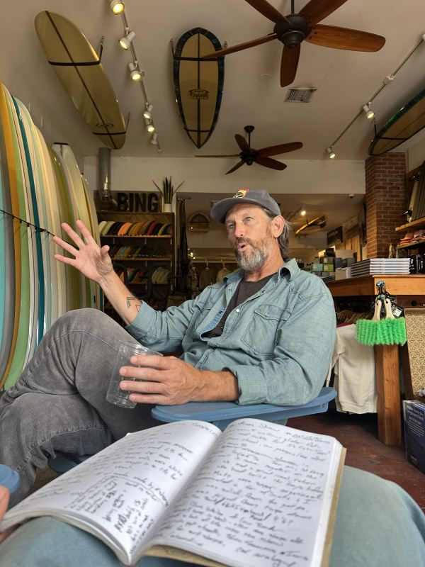 With all sidewalk tables and patio areas out of commission, every indoor cafe was packed. We settled on Coffee Coffee and, after we ordered our drinks, we set up a makeshift “office” next door in Bing Surf Shop. It felt good to be inside and amongst one of the best displays of surfboards in all of San Diego, a proper setting for a righteous chat.